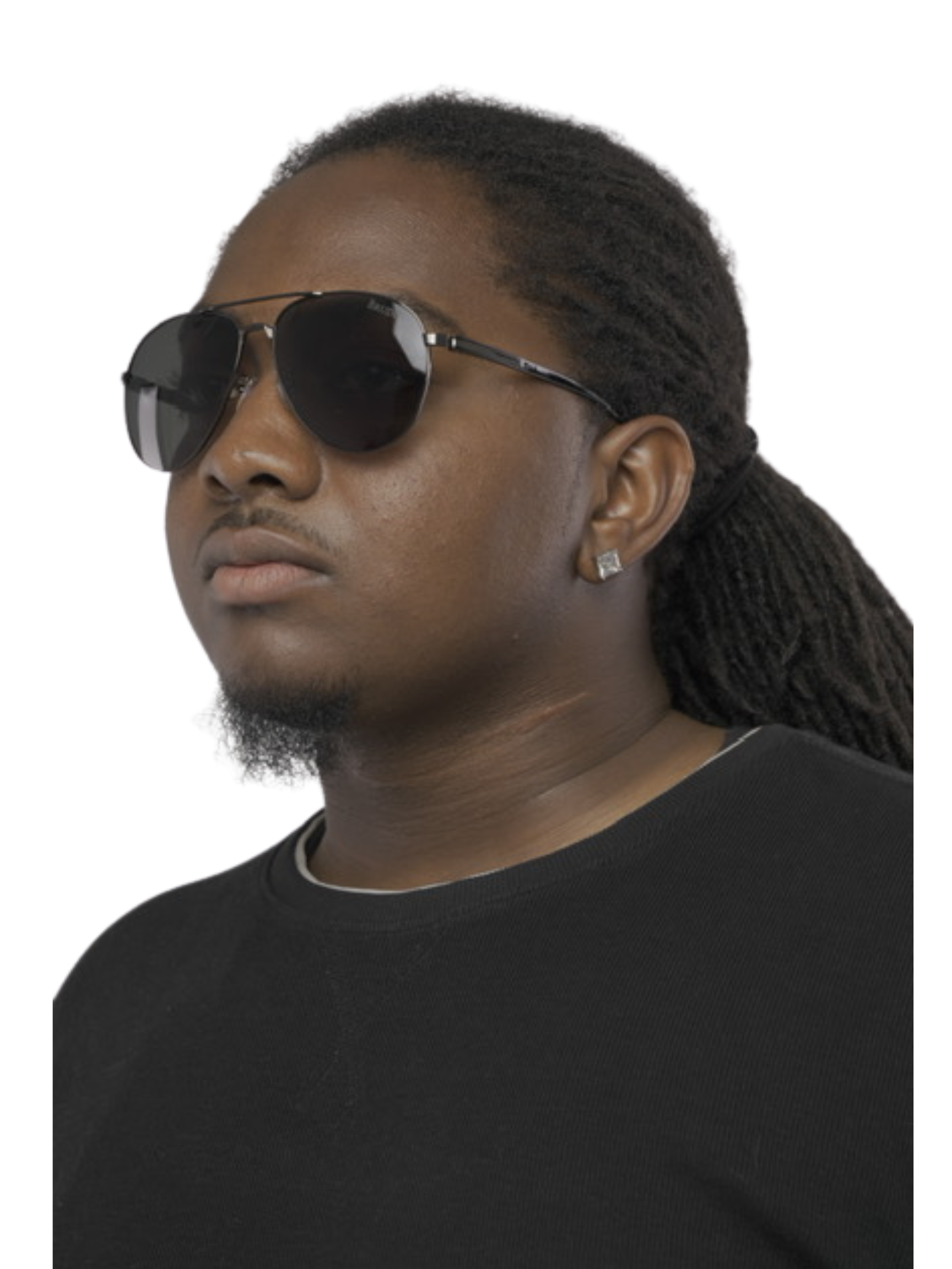 Black oversized rounded aviator sunglasses from Bruden sunglass collection featuring oval frames, tinted lenses, straight arms and silver and black detailing on the sides. These sunglasses are also polarized and made light so that our nose pads prevent marks and keep you comfortable.